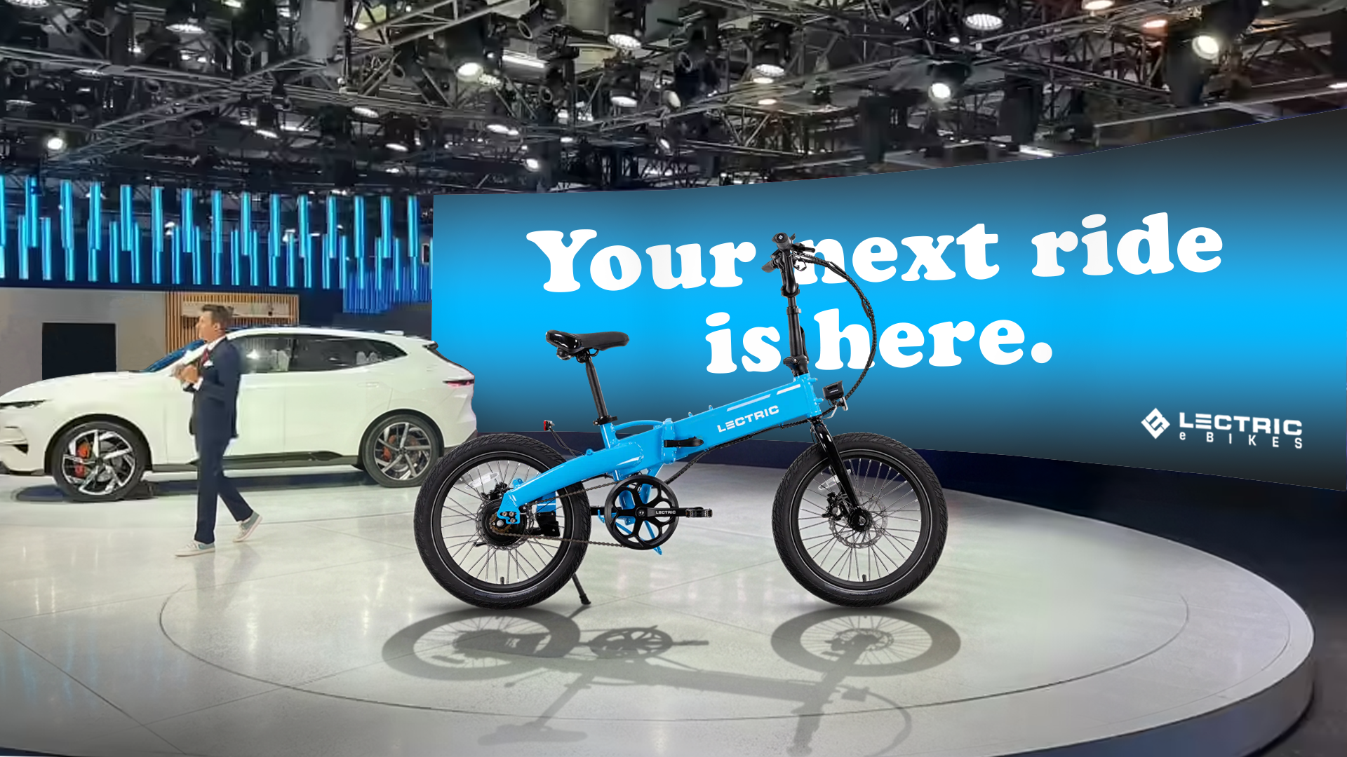 An in-person activation at local car shows. A Lectric eBike gets the full treatment: rotating platform, spotlights, velvet rope, and a $999 price tag.