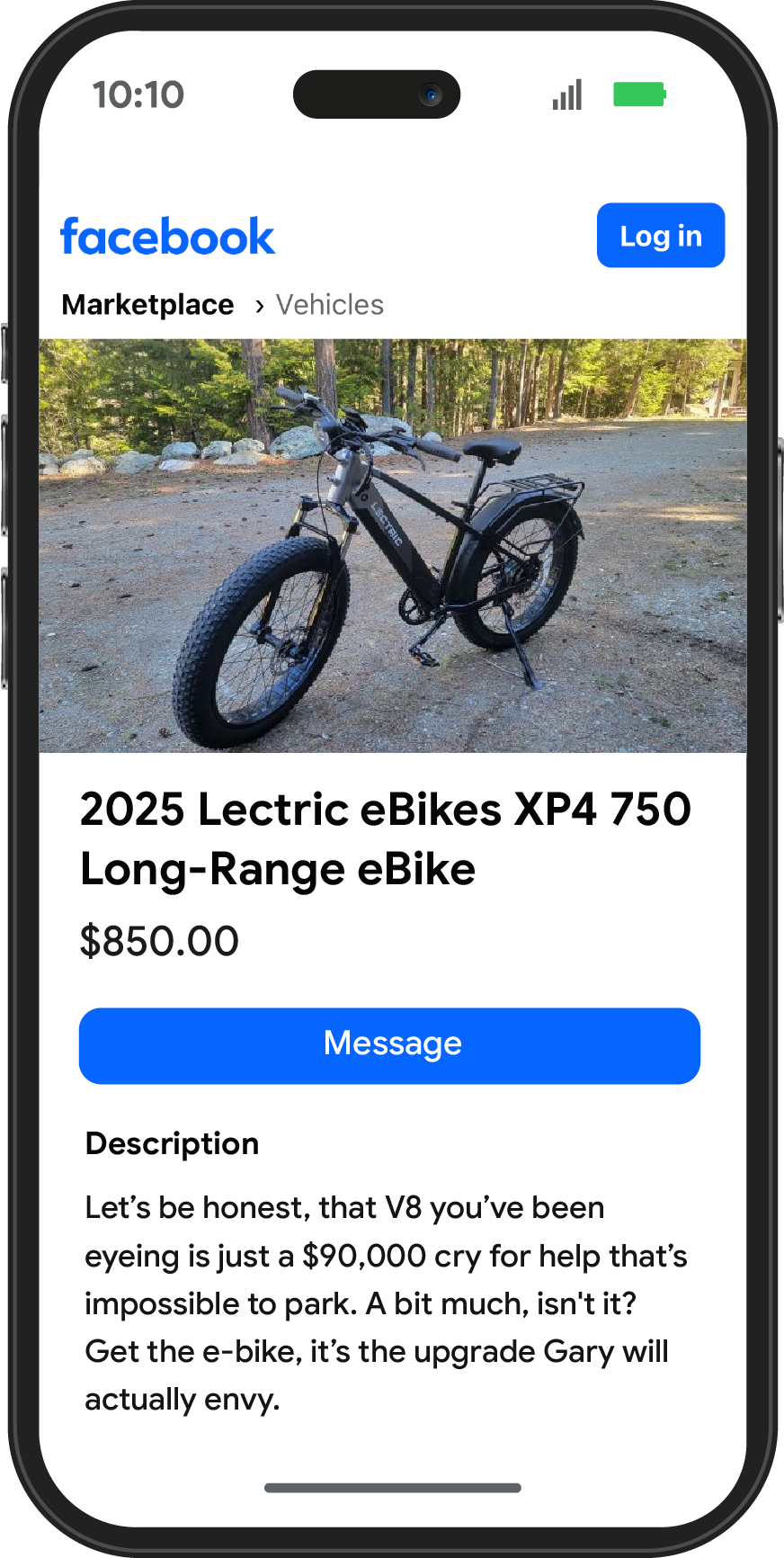 When a 45-year-old man searches "C4 Corvette," our e-bike appears as a promoted listing. The ad copy will roast his search gently while offering the healthier (and cheaper) alternative.